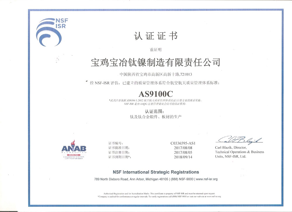AS9100C熱烈祝賀寶雞寶冶鈦鎳取得航空航天質量管理體系認證